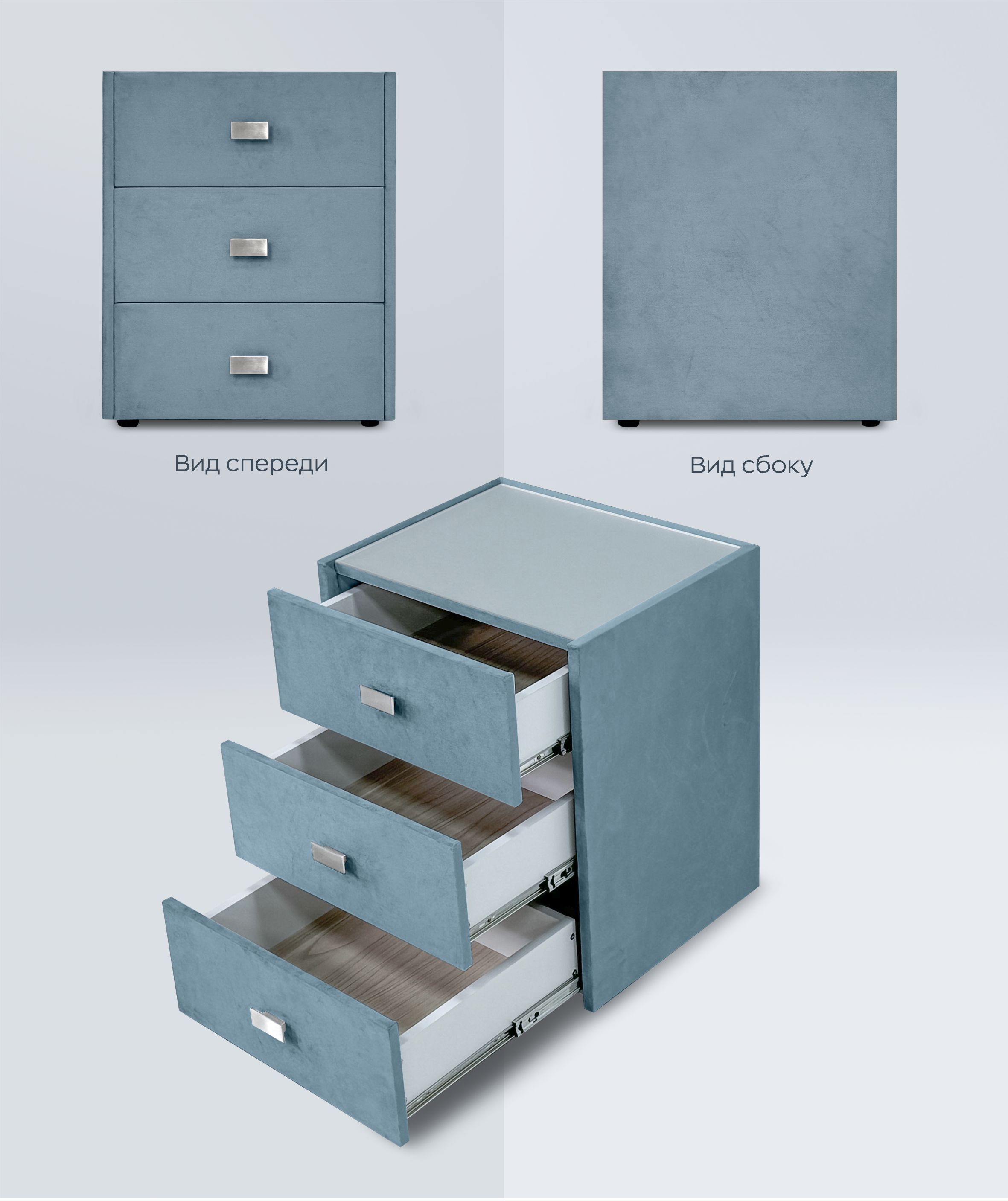 Прикроватная тумба в мягкой обивке дополнит и украсит интерьер любой спальни. Универсальная модель с тремя ящиками станет удобным и практичным дополнением к кровати. Крышка тумбы комплектуется стеклом, которое защищает тканевую поверхность от загрязнений и облегчает ее уход.